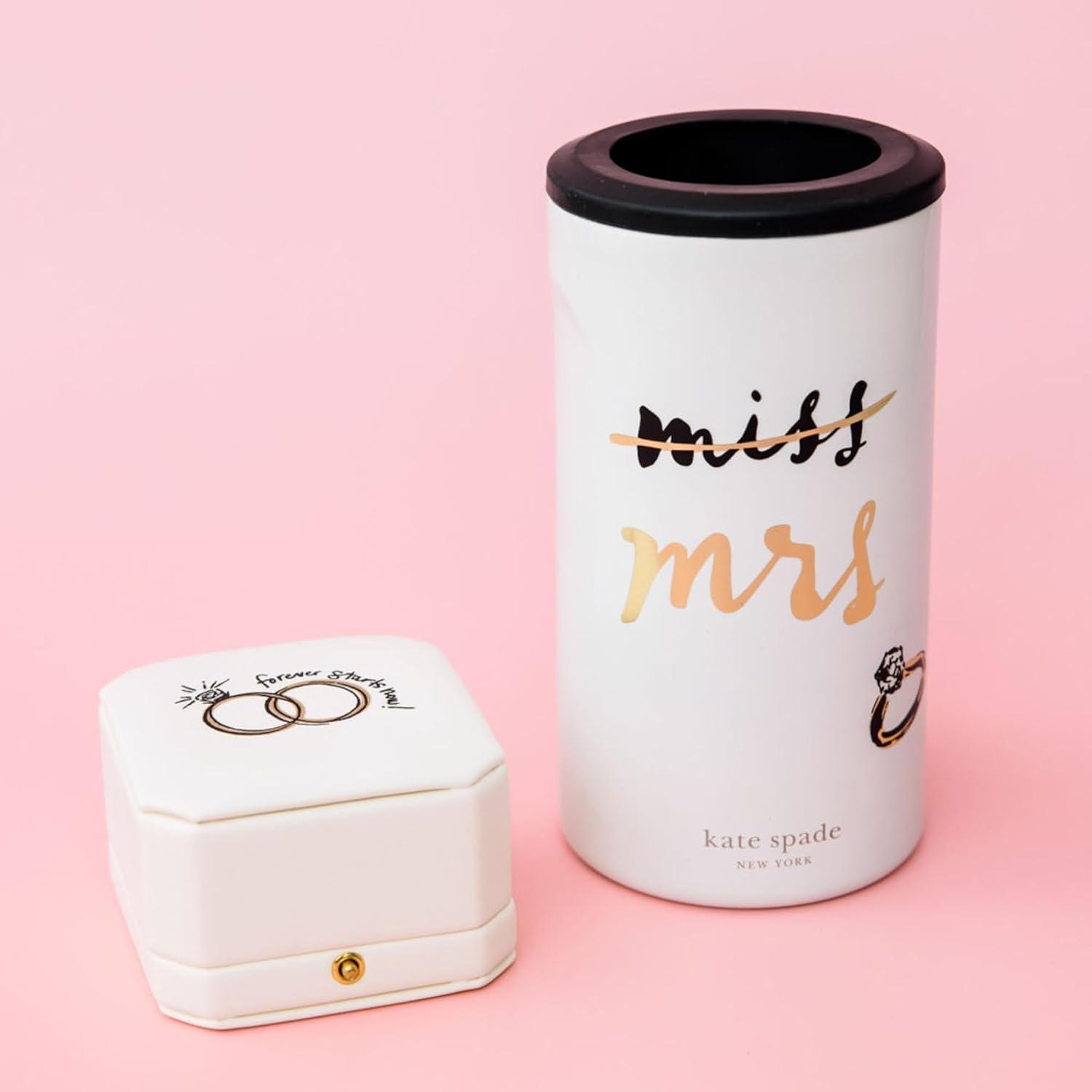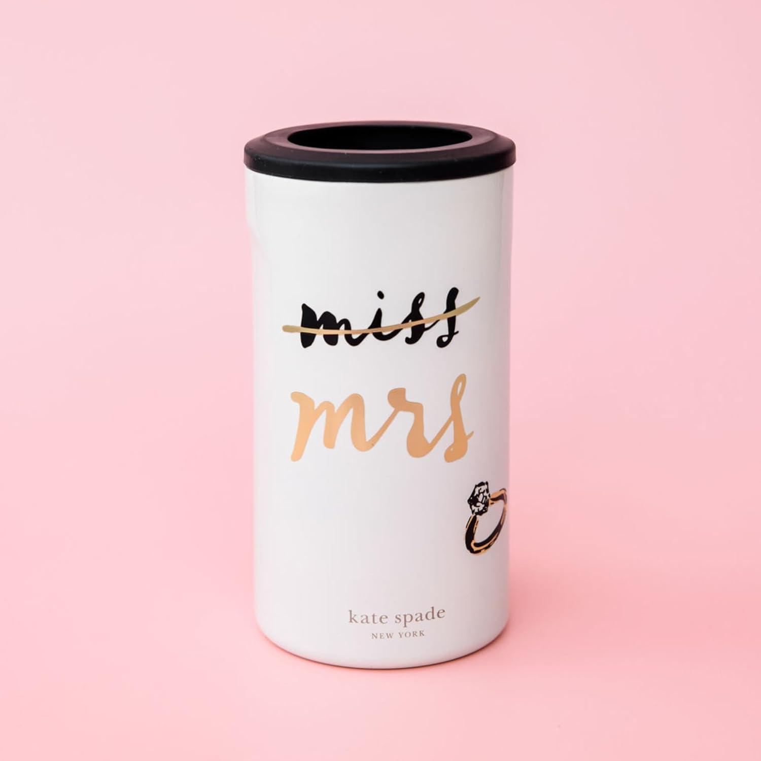 Celebrate the new “Mrs.” with this kate spade new york slim can holder, a chic essential for keeping drinks cool with a personal touch. Crafted from high-quality stainless steel, this holder is designed to fit both skinny and traditional cans and bottles, making it as versatile as it is stylish. Measuring 6×3.25 inches (15.2×8.3 cm), it offers a comfortable grip and dependable insulation to keep beverages refreshingly cold. With kate spade’s iconic logo detail and the elegant “Mrs.” lettering, this beer cozy makes a perfect bridal shower or wedding gift, giving the bride something special to carry through celebrations and beyond. Both fun and functional, this slim can cooler insulated collection is a standout accessory for bachelorette parties, honeymoon sips, or any occasion that calls for a touch of bridal flair.