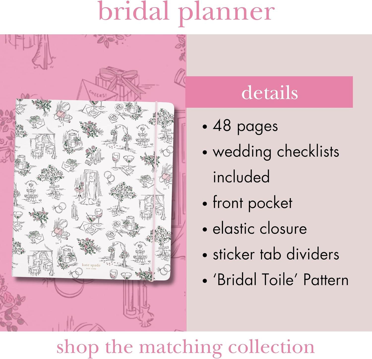 kate spade new york bridal planner 3 ring binder measures 1.5 inches wide. Bride accessories wedding planner book has 48 planning pages and includes sections on: budgeting, guest list, bridal party, invitations and announcements, flowers, music, photography, ceremony, reception, and the honeymoon. Bachelorette party accessories include a clear zipper pouch to store loose items (like business cards, samples, etc.). Don't forget a beloved tradition or lose track of a single detail with kate spade new york's pretty but practical bridal wedding planner that makes the transition from “miss” to “mrs” absolutely unforgettable. This 11.75×10.75″ binder has 48 total pages to keep your planning well organized. This personal planner features sections on all main wedding categories to help you plan out every detail smoothly. Let the wedding countdown begin! Wedding organizer set makes the perfect bridal shower or engagement gift for the bride to be!