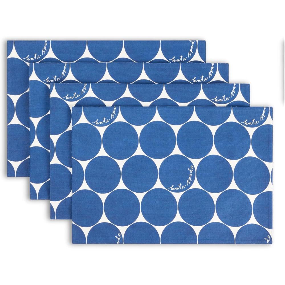add a chic print to your dining table with the kate spade new york joy dot placemat 4-pack set. this placemat set features four placemats that will enliven your tablescape when entertaining. made of 100% cotton with a self-reverse, mod dot print, these colorful placemats will provide a stylish backdrop to your dining table place settings. coordinate these placemats with the in the loop & joy dot reversible table runner and joy dot napkins for a stunning tablescape. machine washable for effortless maintenance.