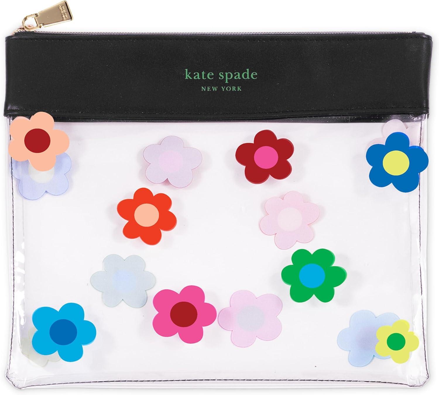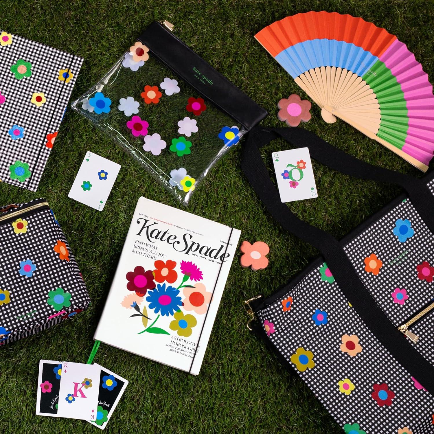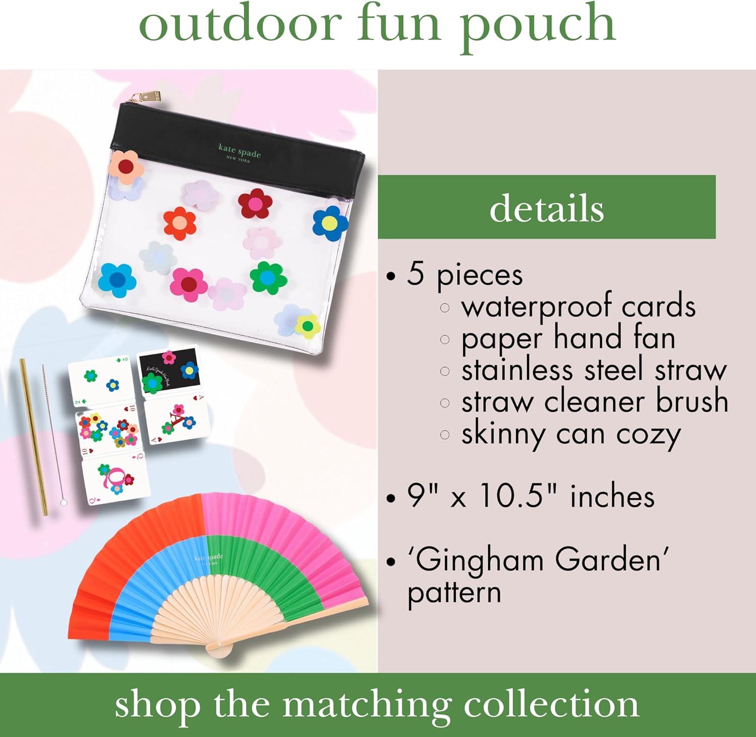 kate spade new york Outdoor Fun Pouch with Clear Pouch, Waterproof Playing Cards, Paper Fan, Stainless Steel Straw and Cleaner, Gingham Garden