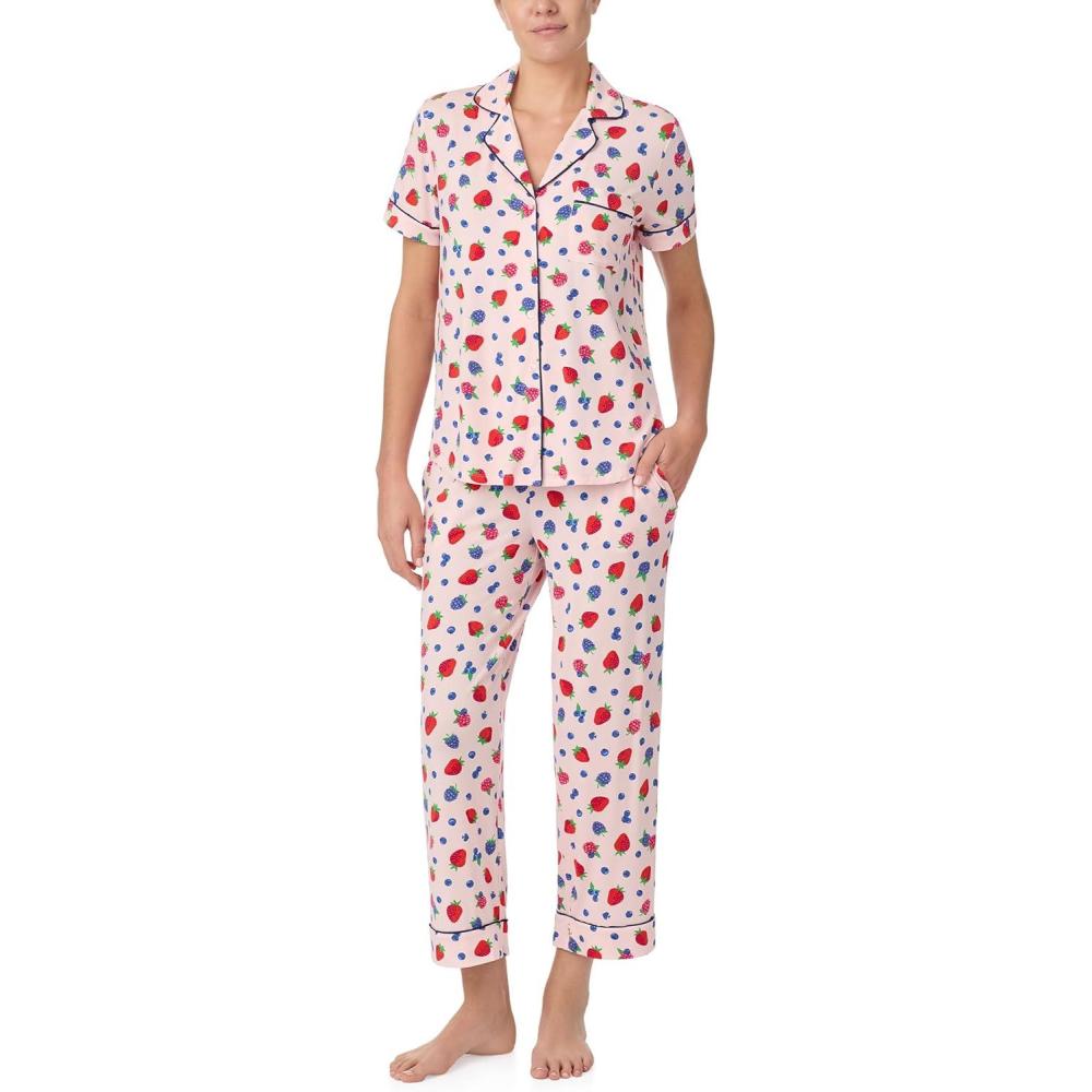 kate spade new york Pajamas for Women 2 Piece Set – Recycled Poly Jersey Notch Collar Short Sleeve Button Top & Cropped Pants(Mixed Berries)